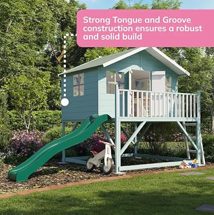 • EASY ASSEMBLY & DURABLE STRUCTURE: Delivered in pre-assembled panels and using the comprehensive instructions provided, assembly is very easy. Made from a solid tongue and groove cladding construction providing a high quality, strong and sustainable structure for your playhouse. Designed to withstand harsh weather conditions. Roofing felt is also included.