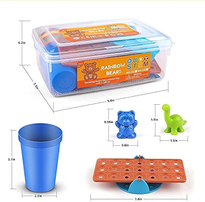 • ?【Toddler learning toys】 This rainbow counting/sorting bear toy game set includes 60 bears,12dinosaurs,6 cups, 1 tweezers,2 Dice,1 balance,10 double-sided cards, and 1 plastic storage box , To create a fun experience, suitable for birthdays and Christmas gifts for toddlers.DY-GO Toddler Toys is the best educational toy for children aged 3, 4 and 5 years old for Christmas or birthday gifts!