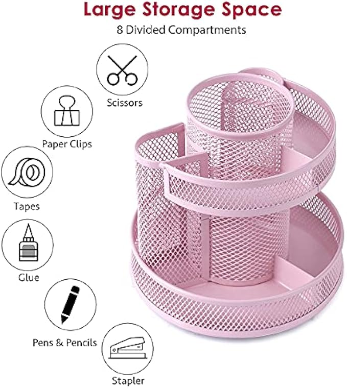 Cute Rotate Desk Organizer, Kawaii Mesh Desk Accessories Pen Holder Stationery Carousel, Spinning Pencil Storage Caddy Tray for School, Home, Office Supplies - Pink