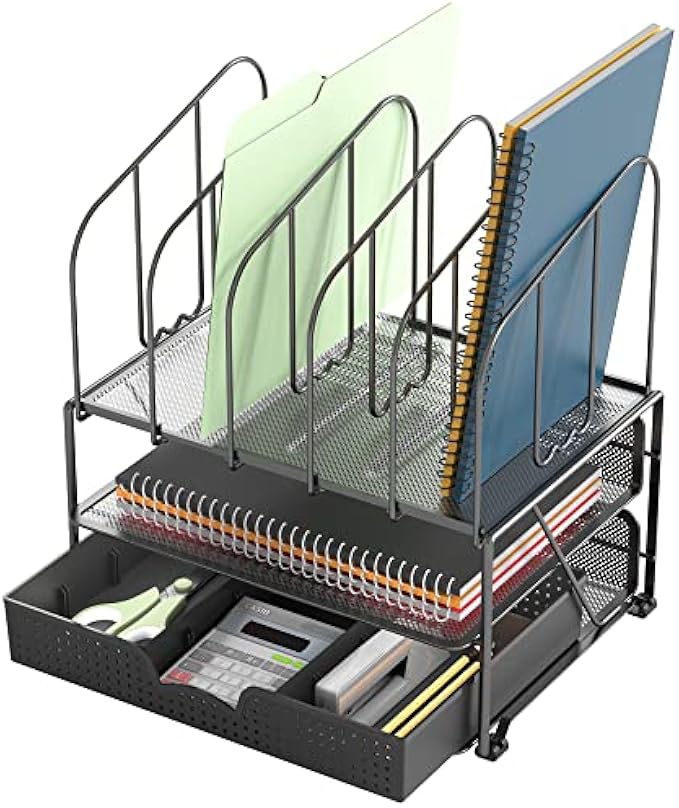 DecoBros Mesh Desk Organizer with Double Tray, 5 Upright Sections and Sliding Drawer, Black