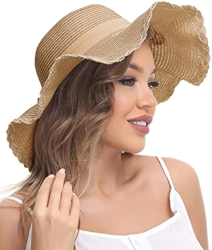 Dolcevida Women Straw Sun Hat Wide Brim UV Protection Beach Hat Summer Floppy Hat with Linen Bow