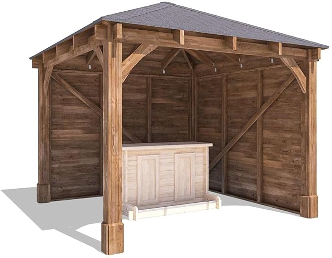 • Gazebo kit includes black roof shingle kit, log bar and two side walls.