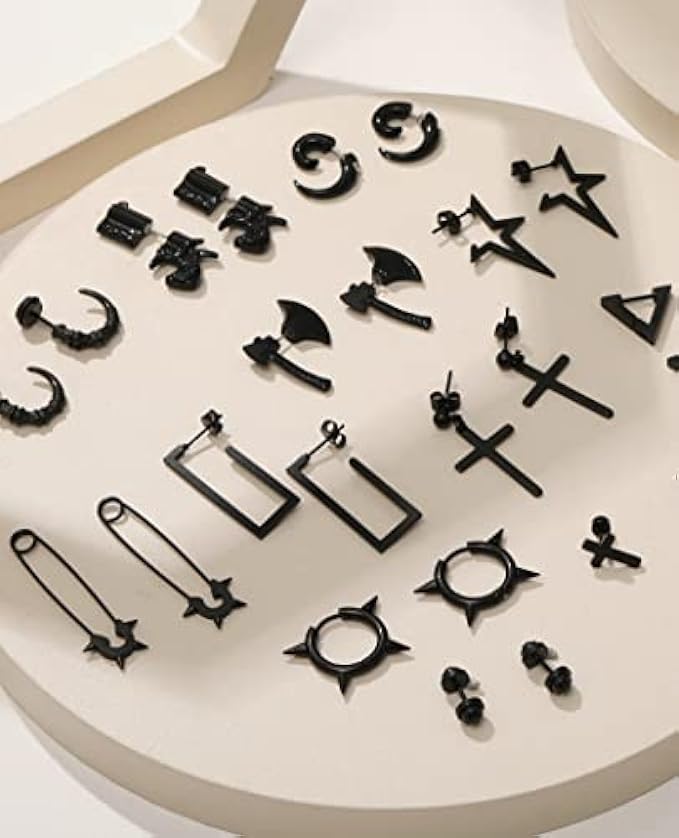 • Black Earrings Multipack: earrings multipack are unisex design, stainless steel plated black. a variety of styles of dangle hoop stud earrings pack, comfortable to wear, each pair of earrings are individually packaged.
