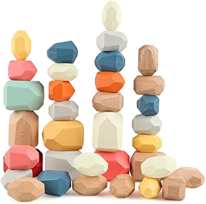 • 36 PCS COLORFUL STONE STACKING BLOCKS:Totally 36 pieces wooden blocks, 8 big blocks, 16 medium blocks, 12 small blocks, these wood rock building blocks have totally 9 colors, every block is a polyhedron, each different in size, color and weight, making stacking game more challenging