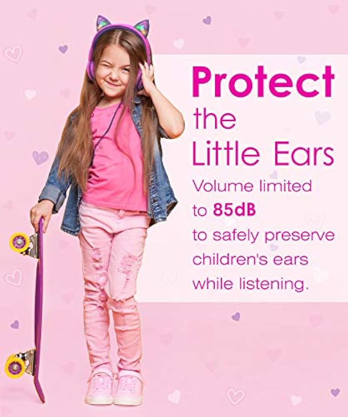 FosPower Kids Headphones with LED Light Up Cat Ears 3.5mm On Ear Audio Headphones for Kids with Laced Tangle Free Cable (Max 85dB) - Hot Pink/Purple
