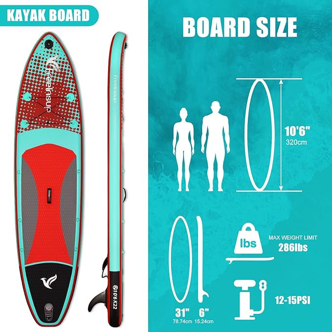 • Rock Solid Stability:Enjoy smooth paddling with confidence.stand up paddle board 10'6“ long, 31" wide with a max load of 305 lbs. inflatable paddleboard offers excellent stability for all skill levels. Conquer various water conditions, from calm lakes to gentle rivers.