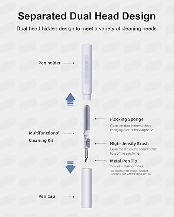 • Separated Dual Head Design: Hagibis 3-in-1 earphone cleaning kit with Flocking Sponge, High-density Brush and Metal Pen Tip, dual head hidden design to meet a variety of cleaning needs