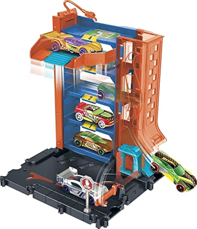 • There's plenty of parking and awesomeness in the Hot Wheels City Downtown Car Park with 4 levels to hold 4 different vehicles plus moveable features like manual car lift, electric vehicle "charger" and translucent exit ramp!