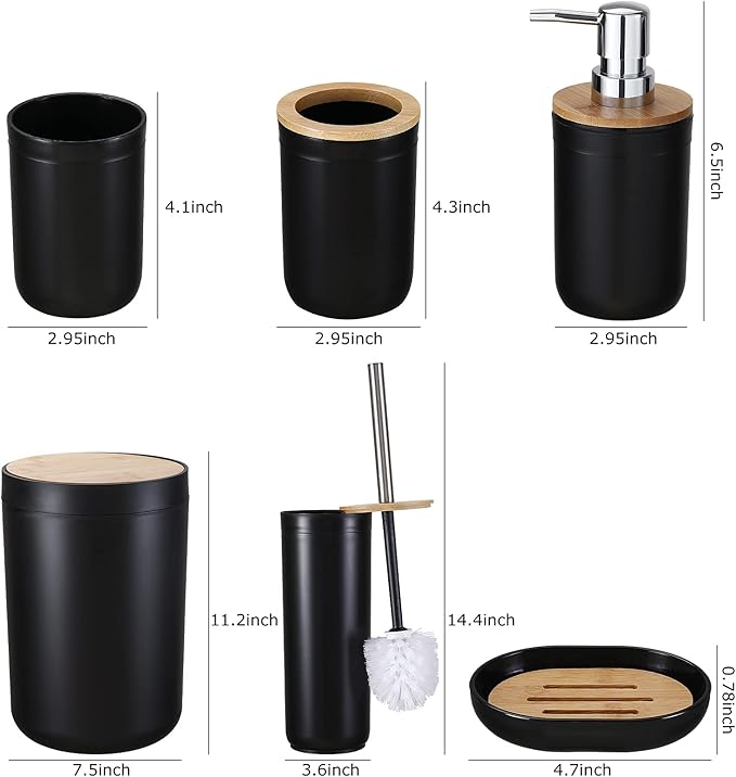 Multi functional bathroom accessory set -9-piece bathroom accessory set includes 1 toothbrush holder, 1 toothbrush cup, 1 soap dispenser, 1 bathroom brush holder, 1 trash can, 1 vanity tray, and 2 QTip brackets. Keep the bathroom organized and add a simple texture style.