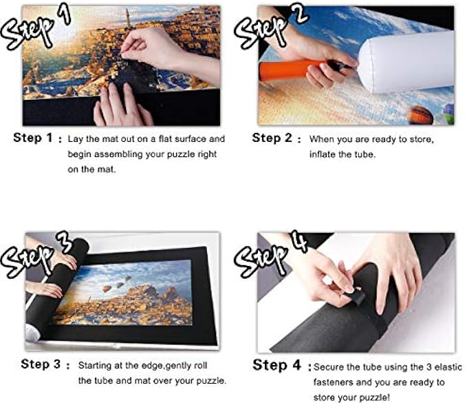 • 【How To Use It ?】 Our puzzle saver mat kit is optimized for easy use and convenience. That's why it is designed to be packed in a single minute with 4 steps: first inflate the tube - then roll up the puzzle mat - after that tie up three bands - finally put it into the bag. That's it! Pretty easy right?!