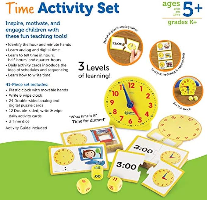 • 41-Piece Set includes plastic clock with movable hands, write & wipe clock, 24 double-sided analog and digital puzzle cards, 12 double-sided, write & wipe daily activity cards, 3 time dice plus activity guide.