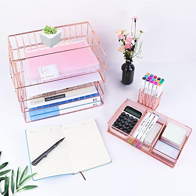 • 【PRETTY ROSE GOLD DESKTOP ORGANIZER】 Gorgeous rose gold desk organizer, includes stackable 4 tier trays, 3 compartment mesh storage tray, pen holder. Perfect for holding Letter/A4 size paper, folders, stationary, mails desk accessories.
