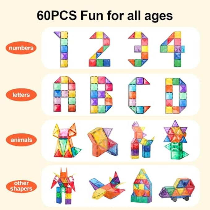 • ❤️【60 PCS Magnetic Building Tiles】Mideer Magnet Building Tiles are Available in Many Shapes, and Translucent Colors Reflect Charming Sunlight! This 60 PCS Magnetic Block Set Includes 20*Small Squares, 12*Equilateral Triangles, 12*Right Triangles, 6*Long Triangles, 4*Window, 2*Window Frame, 4*Door, 1* Color Page with Many Reference Models.