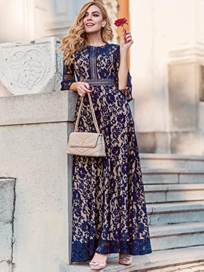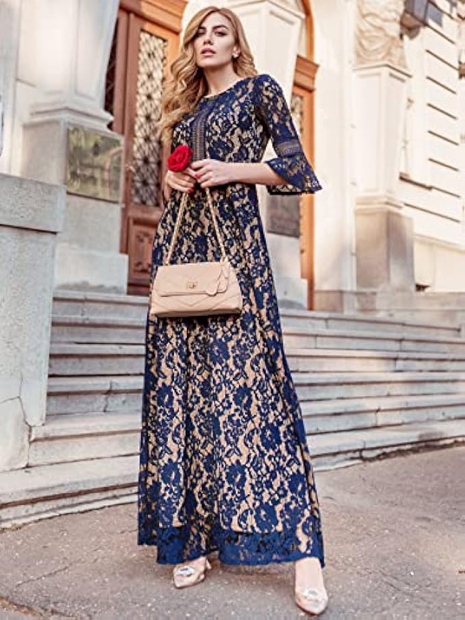 MISSMAY Women's Vintage Full Lace Contrast Bell Sleeve Formal Long Dress