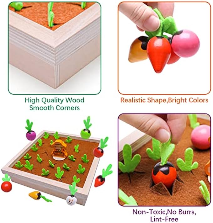 • 【Children’s Early Education Toys】 The carrot planting game toys is a new kind of learning toy for toddlers. The wooden toys have 24 different colorsize carrot, 8 memory card, 1 farmer, 1 wooden board which has 24 holes to grow radish. Size: 9.2* 9.2* 2.3 inches.