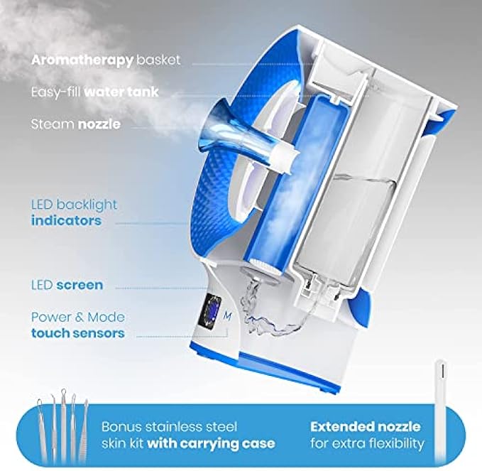 • Bonus Features: Aromatherapy & Extraction Set: A special aromatherapy basket allows customizable herbs, flowers, and beneficial oils to be infused into the steaming protocol for bespoke luxury treatments. The included 5-piece stainless steel extraction set helps to safely and gently tackle pore concerns like whiteheads, blackheads, and minimize skin blemishes. This makes it the perfect gift for at-home users and even for aestheticians looking to enhance professional treatment rooms.