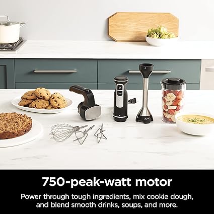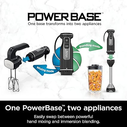 • With the Ninja Foodi Power Mixer System, you can tackle all essential food prep tasks in no time. Its 750 peak power-dense motor lets you power through tough ingredients, evenly mix cookie dough, mix drinks or soup. Simply connect the PowerBase with one of two accessories to transform it into anything you need. Mix, stir and blend - all in one.
