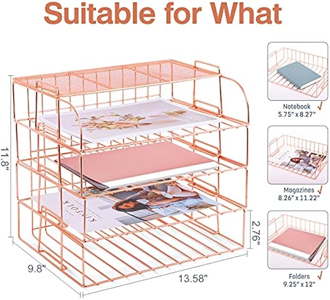 • ▶Multifunctional Office Tray- This rose gold desk organizer includes four file trays and one upper display shelf plus a box of binder clips. Large enough to handle daily-used files, papers, letters, files, folders, mail and much more.