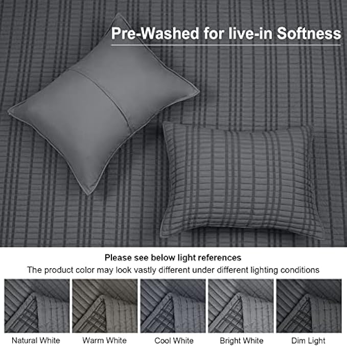 PHF Seersucker Washed Quilt Set Full/Queen Size, Drop Nicely, 3PCS Soft Bedspread, Boho Stylish Bed Spread for Summer, 1 Textured Stripe Coverlet 90" x 90" and 2 Pillow Cases, Charcoal/Dark Grey