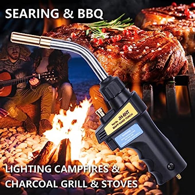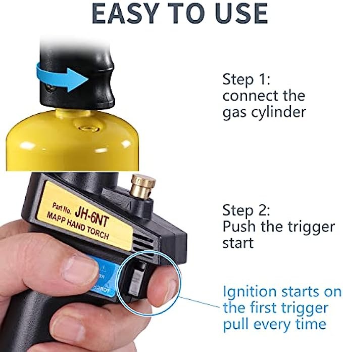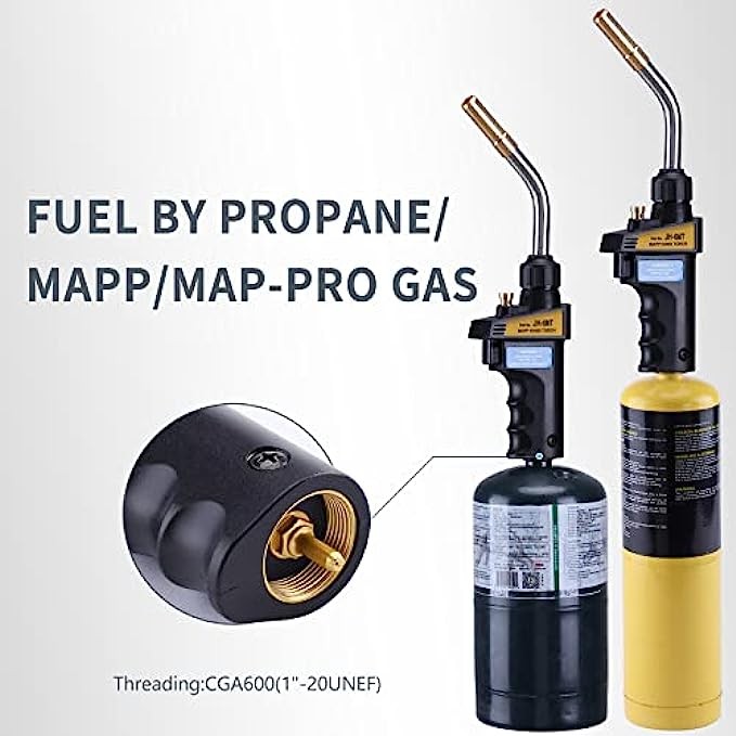 • 【Multipurpose torch】Trigger start propane torch head, provides a blue swirl flame.Perfect for welding, soldering, heat shrinkage, burning steak, etc. Fuel by MAPP/MAP Pro/Propane CGA600 14.1-16oz cylinder.