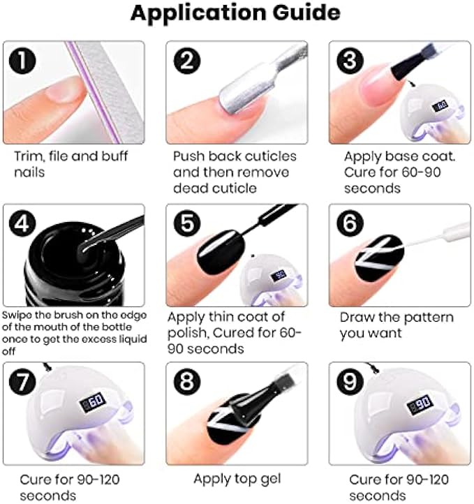 • BUILD IN THIN BRUSH:New design with the painted gel nail polish and the pull line pen combine,it is super convenient for the professional salon beauty salon or at home personal use for starters.Each bottle has a thin pen brush,no need to change and wash clean the drawing liner pen brush when doing the nail art.