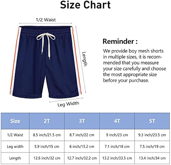 • Multiple sizes: we provide boy mesh shorts in multiple sizes; as different sizes may be needed for people of the same age, you are recommended to choose the most appropriate size by referring to our size chart before your purchase; this 2T size mesh shorts fit most boys who are 2 years old