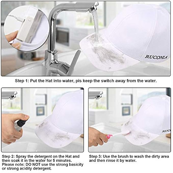 • The LED hat can be gently hand washed (scrub only, can not knead and twist ) with water up to 50 degree centigrade or natural soap, but the battery box must be taken off or keep away from water before washing. Please take off the battery box and please keep the plug of wire away from water. This fabric must not be washed in washing machine. Dryer or iron is forbidden.( Hang dry only).