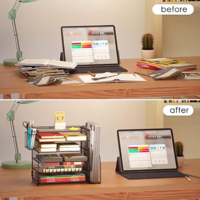 • Unique 5+1+1 Shelves Design: 5 Tier sliding trays are perfect for storage all your A4/letter sized papers and file folders, 1 vertical magazine rack is ideal for place your other books and magazines, 1 pen holder is ideal for organize all your pen and pencils.