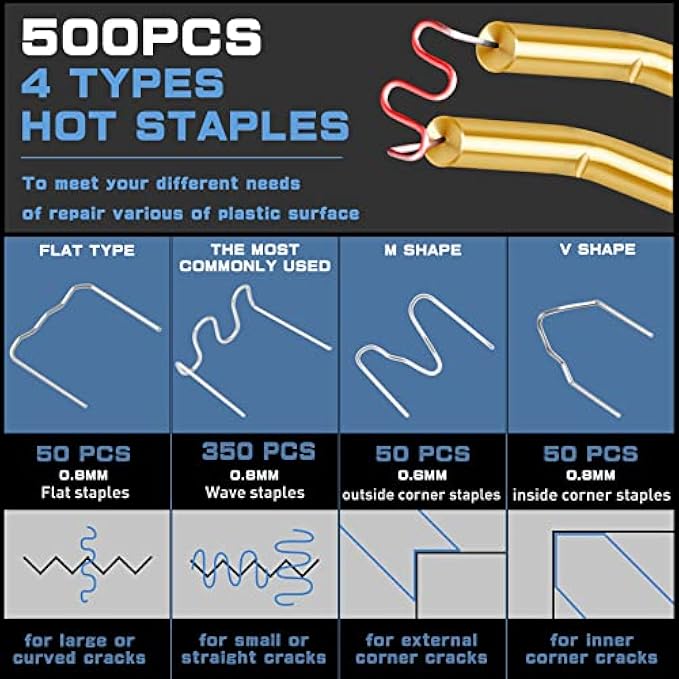• Abundant - Comes with 500PCS hot staples (4 types: 350PCS most commonly used wave staples, 50PCS flat staples, 50PCS M staples and 50PCS V staples), meet a variety of plastic repairs with different shapes. After you do a lot of repairs, you will find it very interesting to make broken plastic parts work again.