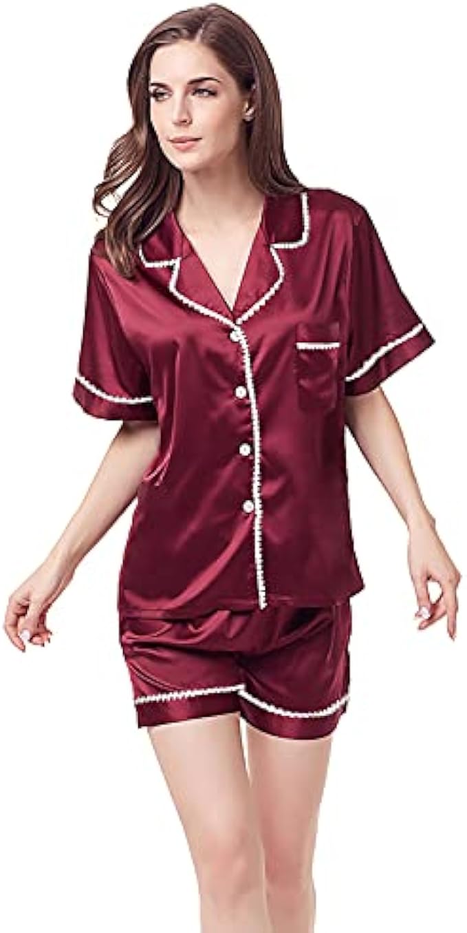 Women Silky Satin Pajamas Short Set Plain Matte Two-Piece Pj Sets Button-Down Sleepwear With Contrasted Piping