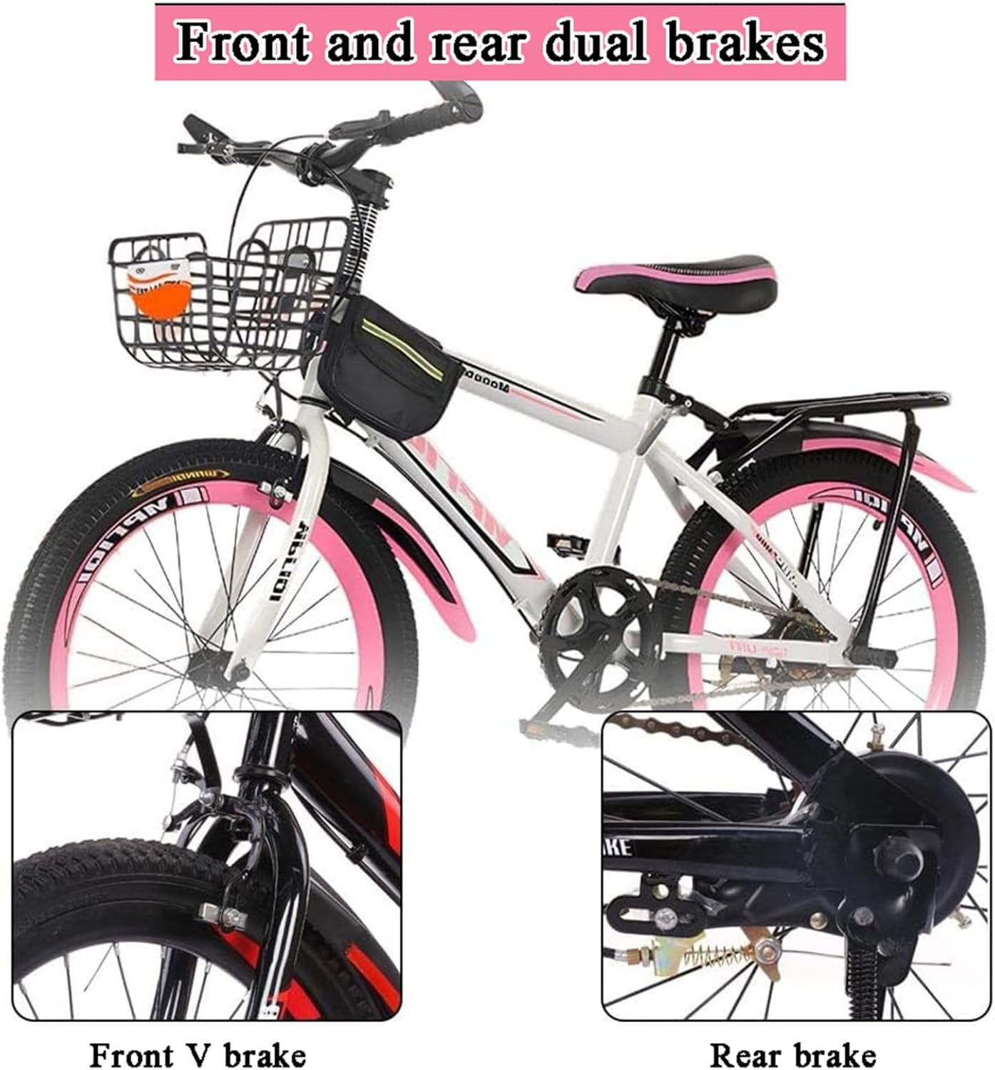 • Front and rear dual brakes: This bicycle is equipped with front and rear dual brakes, which can provide the most sensitive braking effect, and both front and rear are equipped with mudguards to prevent mud splashing.